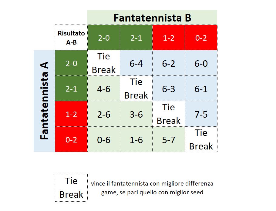 In questo modo i due fantatennisti che si affrontano saranno abbinati ciascuno ad un tennista diverso e il risultato della sfida calcolato come di seguito.